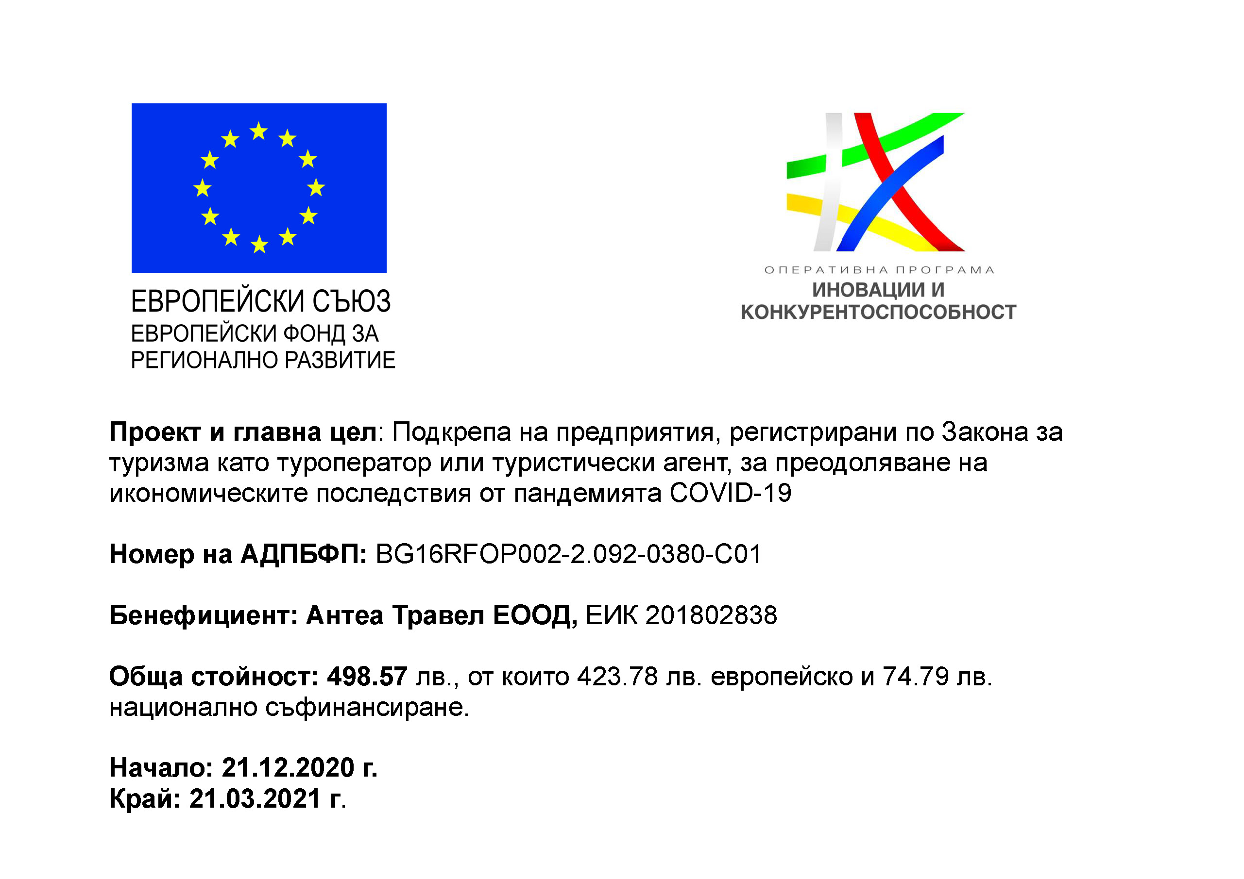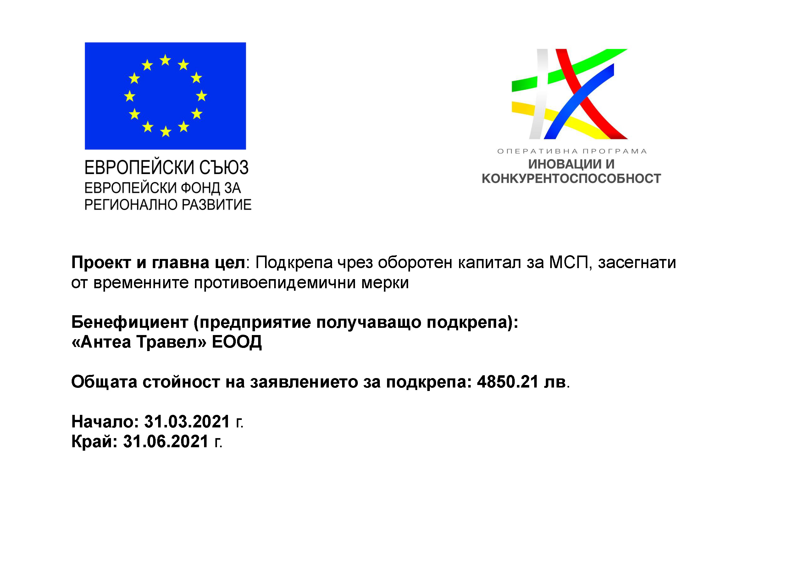 Изпълнението на договора по проект BG16RFOP002-2.092-0380-C01 за безвъзмездна финансова помощ цели да осигури на Антеа Травел ЕООД оперативен капитал за преодоляване на недостига на средства или лиспа на ликвидност, настъпили в резултат от епидемичния взрив от COVID 19.