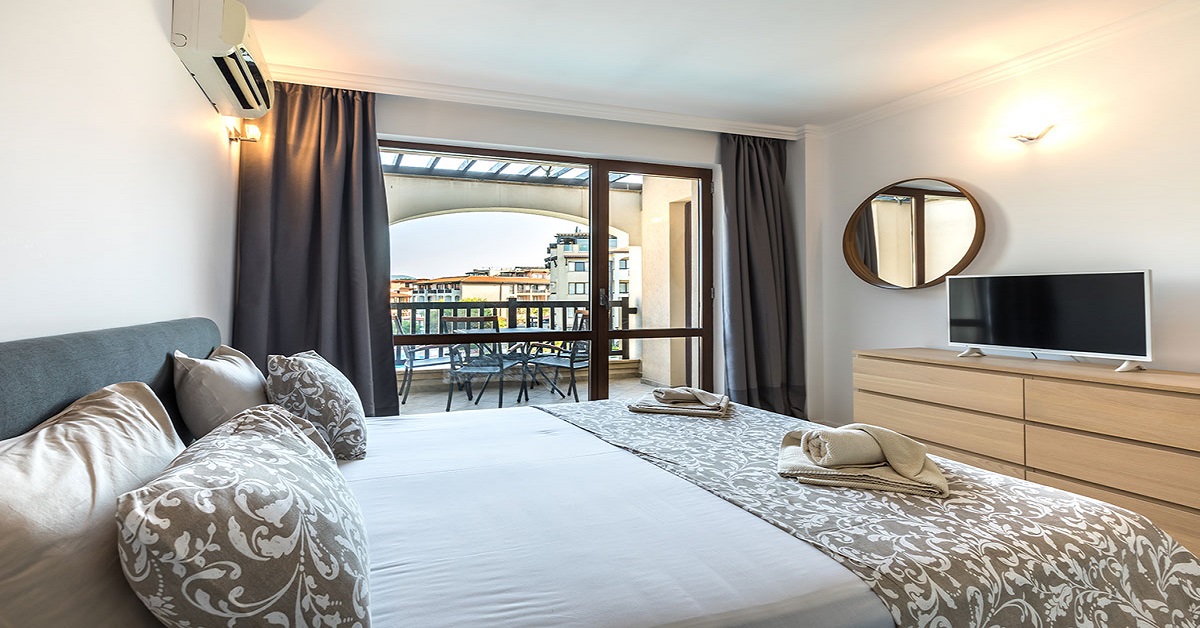 Едноспалните апартаменти се състоят от куненски кът, всекидневна-хол, самостоятелна спалня, санитарно помещение, тераса с градинска мебел и с гледка към море или градина.