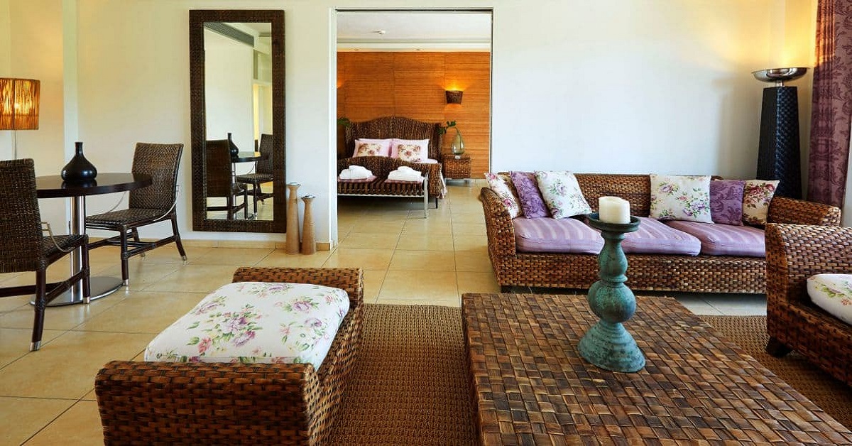 Апартамент делукс с изглед към морето (45 кв.м) - романтичен стил, спалня с двойно легло, удобна дневна зона с диван, халати и чехли, две обзаведени тераси.