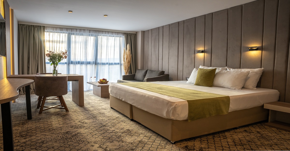 Junior Suite - 40 кв.м. - двойно легло (2х100/200 см), разтегателен диван, климатик, отварящи се прозорци, кът за отдих, хотелски LED телевизор, интерактивна теливизионна система, мини бар, термокана, кафе и чай комплимент, сейф, телефон с директна външна линия, безжичен интернет, сешоар, баня с душ и/или вана, халати, хотелска козметика. Част от помещенията имат и тераси.