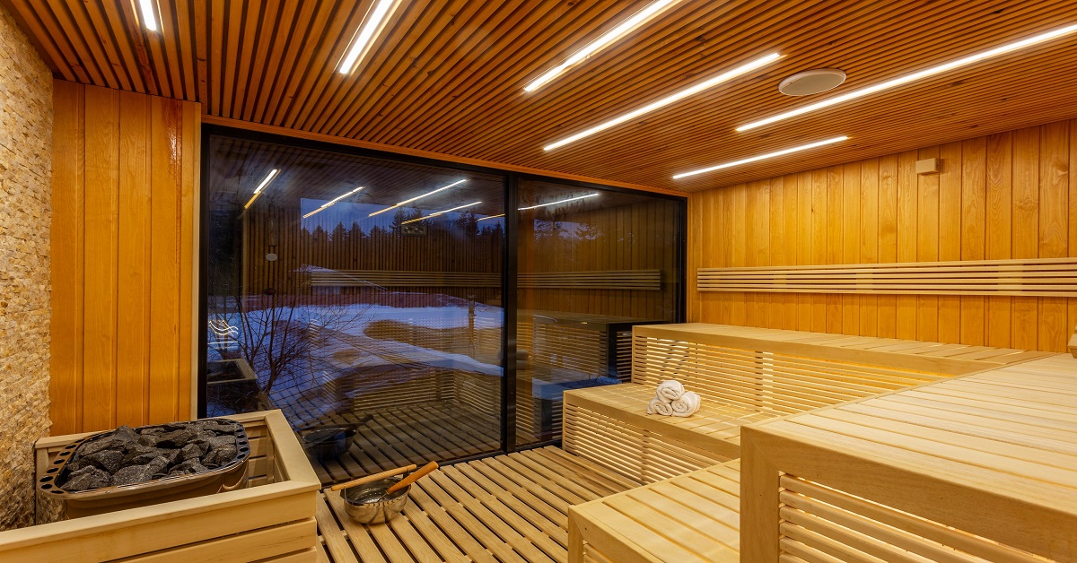 душове и солна стая, козметични терапии и масажи, турска баня (хамам), релакс зона с дървени вани, хоризонтален душ, ВИП джакузи, фитнес център с висок клас уреди Technogym.
