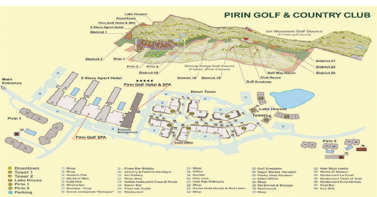 Местоположение: Разположен в югозападната част на България, в красивата Разложка котловина, сгушен в прегръдките на трите планини Рила, Пирин и Родопи, Пирин Голф и Кънтри клуб е само на 5 мин. от курорта Банско.