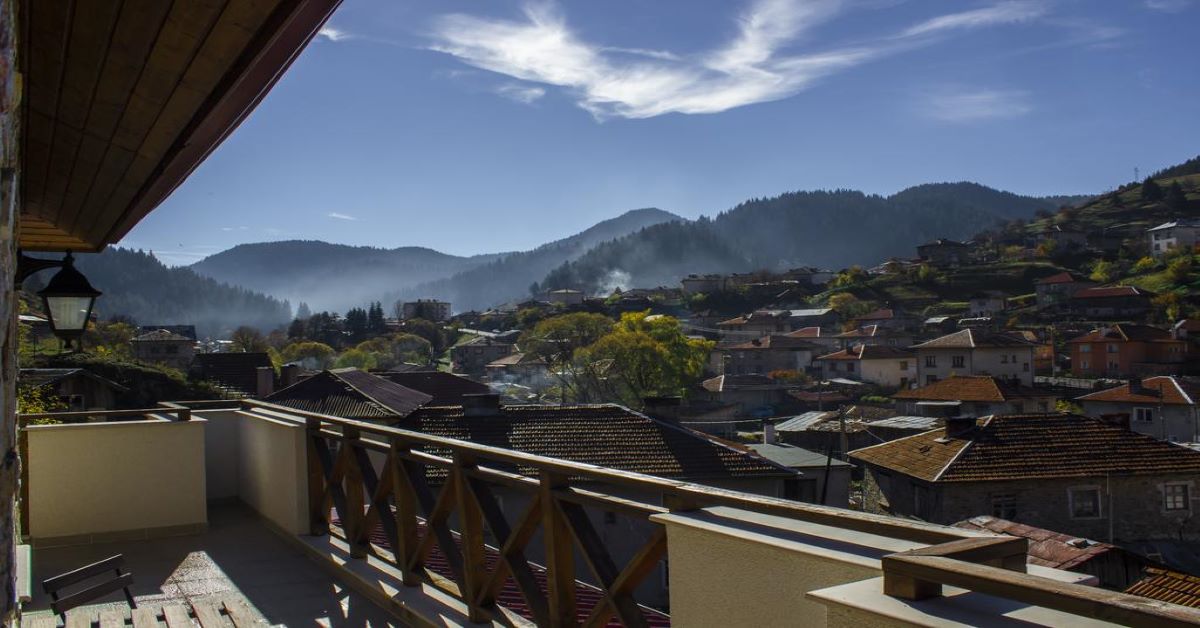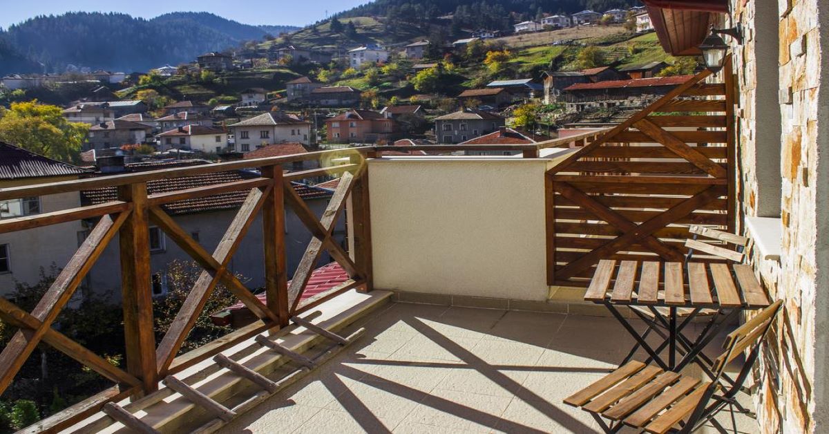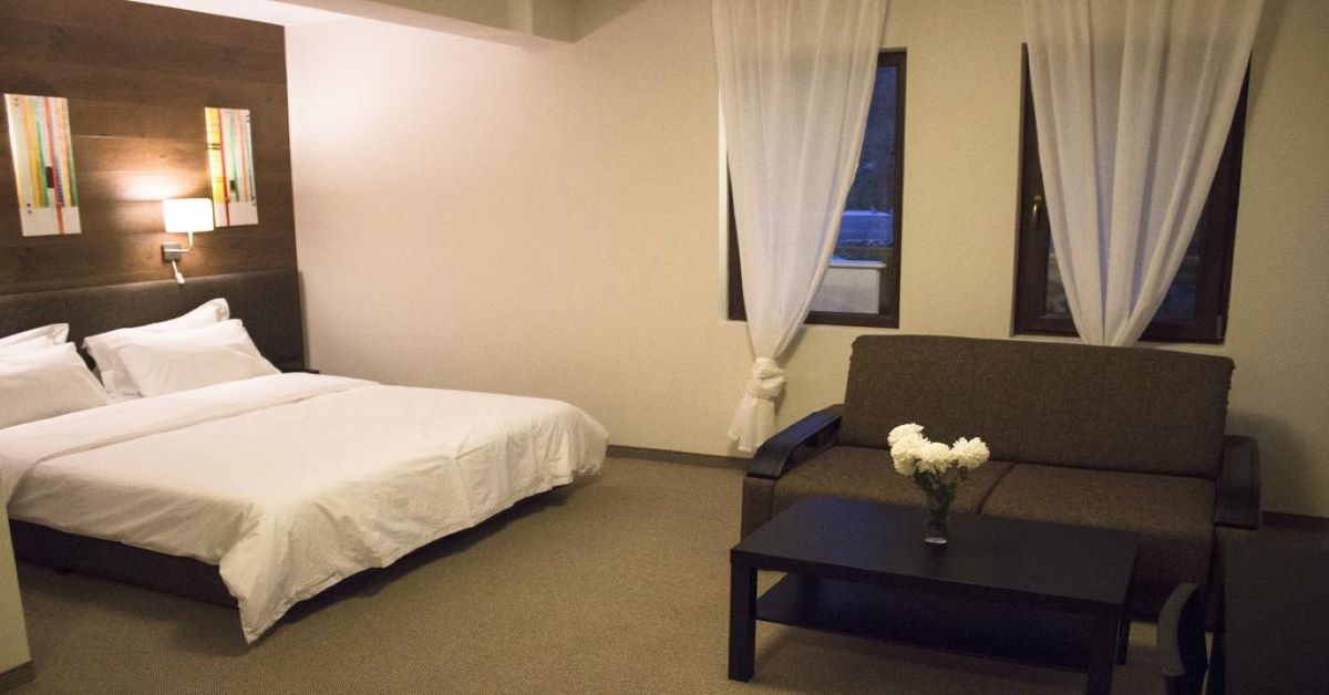 Студио - просторно помещение с двойно легло (180 см) и балкон с невероятна тристранна гледка към село Триград и планините наоколо, телевизор, сейф, баня с душ, минибар и разтегателен диван.