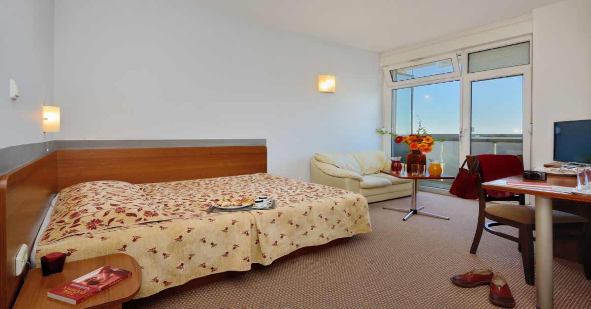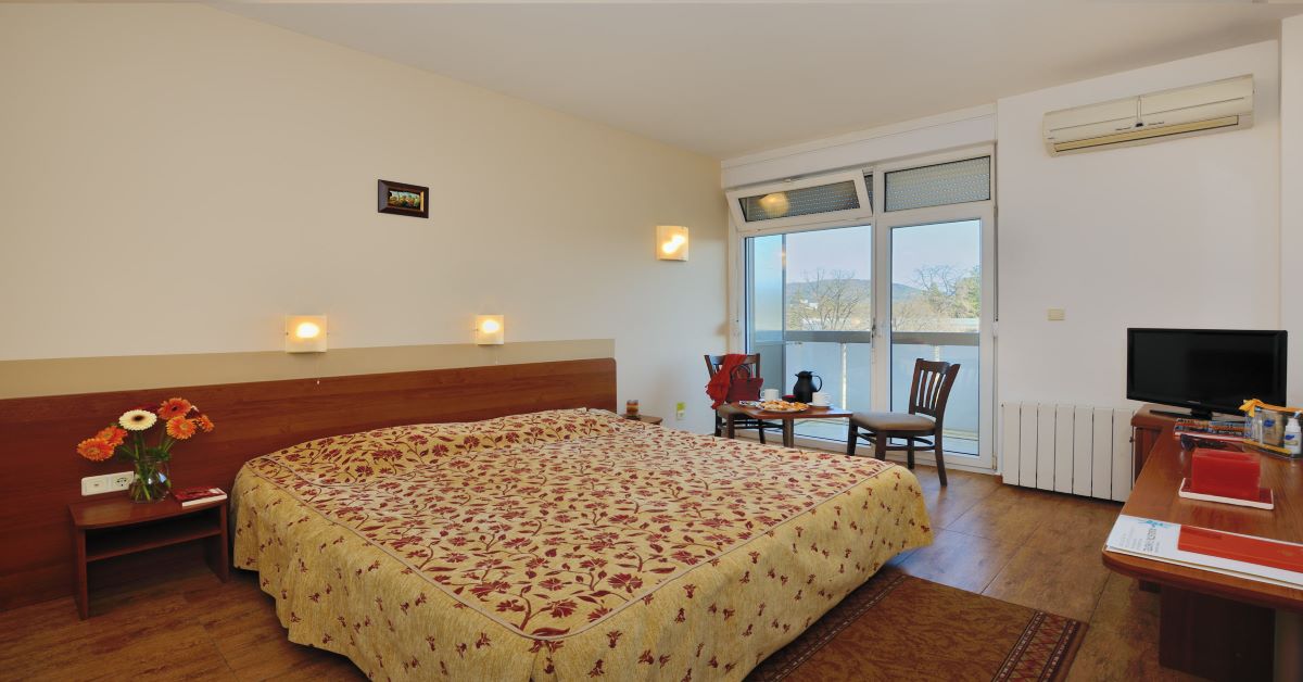Стаи: Eдинична стая - спалня с размери 150/200 см., тераса, телевизор, телефон, климатик и хладилник, вана или с душ, телефон и сешоар, индивидуално настройване на отоплението.