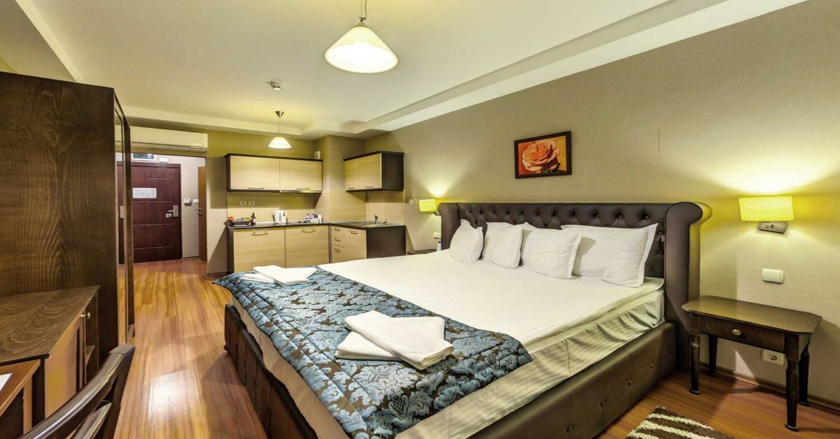 Хотел: Регнум Банско Ски Хотел и СПА 5* предлага настаняване в 130 студиа и апартамента.