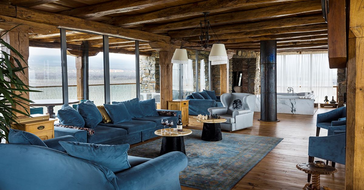 Суит Мускат, разположен в двете овални кули на замъка - голямото кръгло легло тапицирано в естествена телешка напа, за банята избрахме един от най-древните камъни – Tравертин. От двете кули се разкрива 180 градусова гледка към лозовите масиви на Шато Копса, Стара планина и Средна гора.