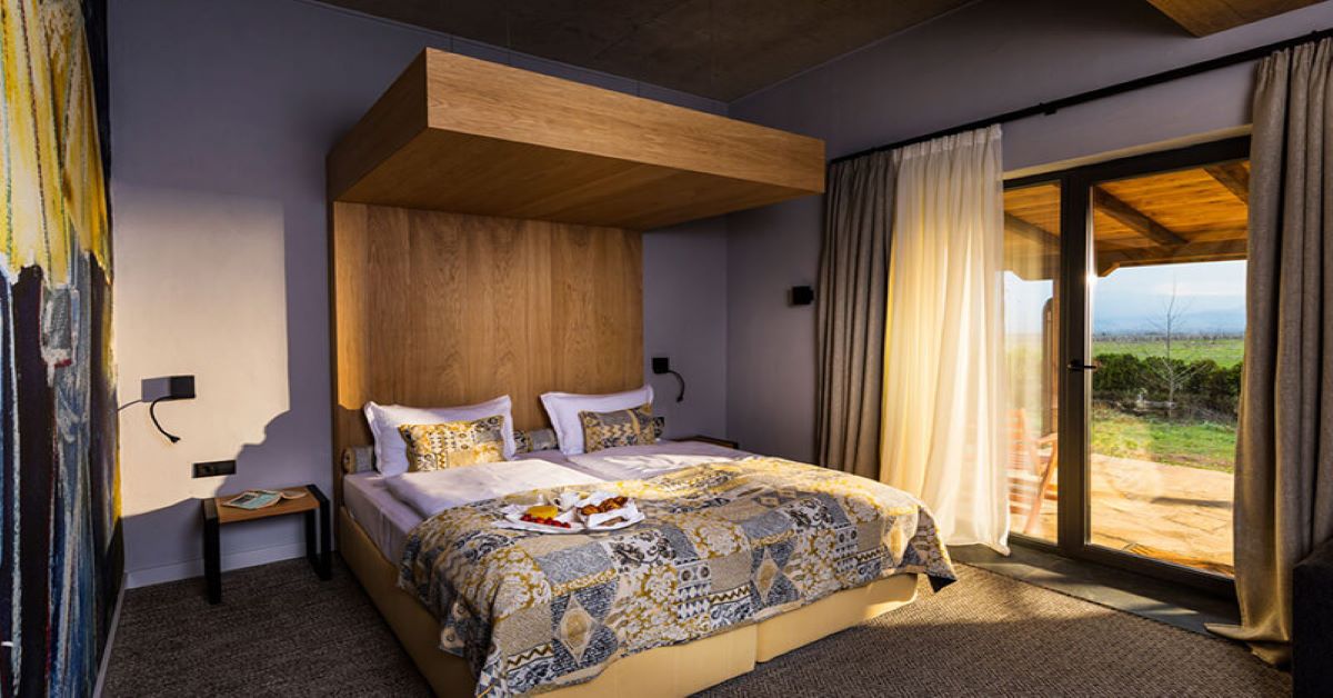Бутикова стая Шардоне - В интериора преобладават тоновете на старо злато и сламенно жълто с конячени отенъци, същите тези тонове, които откриваме в отлежалите вина от сорта Шардоне. Дори и Викторианското легло, ръчно изработено от масивен дъб е в златисти медени отенъци. От тази стая се разкрива гледка към Средна гора с особенно красиви залези.