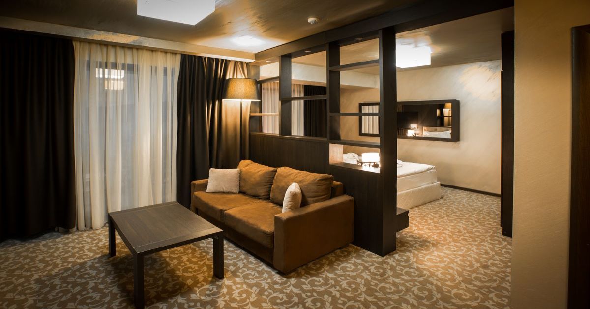 Двойна стая лукс 40 кв.м. - King size спалня, баня с вана или с душ кабина, работно бюро, плазмен телевизор с кабелна телевизия, мини бар, централно отопление, климатик, телефон, WI-FI, халат за баня и сешоар, сейф, паник бутон, противопожарна система.