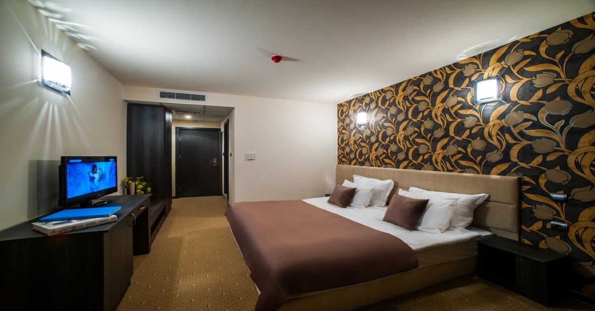 Стаи: Двойна стая 25 кв.м. - панорамна гледка към града и боровата гора, двойно легло или две единични легла, баня с вана или с душ кабина, работно бюро, плазмен телевизор с кабелна телевизия, мини бар, централно отопление, климатик, телефон, WI-FI, халат за баня и сешоар, паник бутон, противопожарна система.