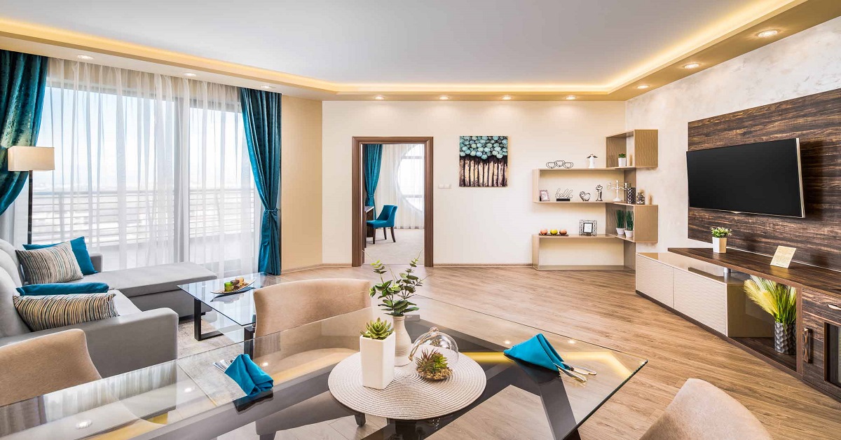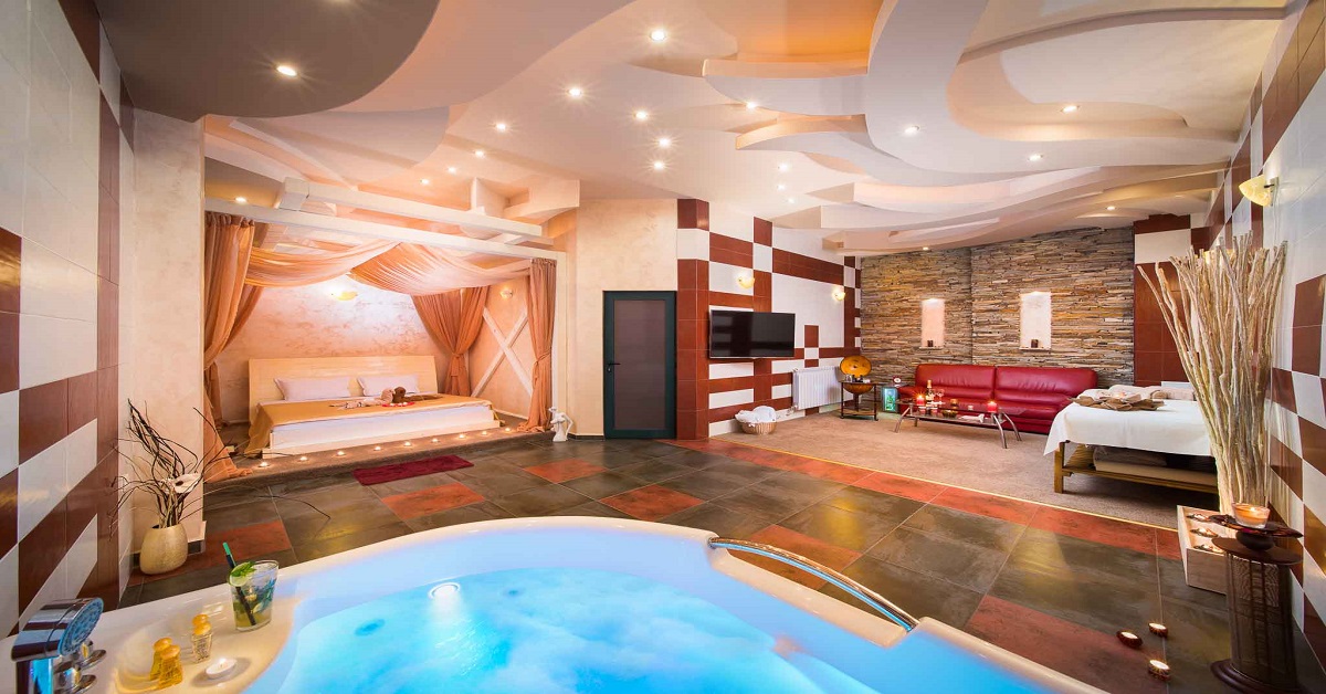 Делукс апартамент 70 кв.м - двойно легло, балкон, два LCD Телевизор 39”, баня: хидромасажна вана, душ кабина, биде, огледало, сешоар, чехли, комплект хавлии и халат, висок клас козметика, телефон, широк диван във всекидневната, трапезна маса, работен кът, кухненски бокс, мини бар, сейф, микровълнова фурна, хладилник, домакински принадлежности и прибори, климатизация, безжичен интернет, кана за приготвяне на кафе/ чай.