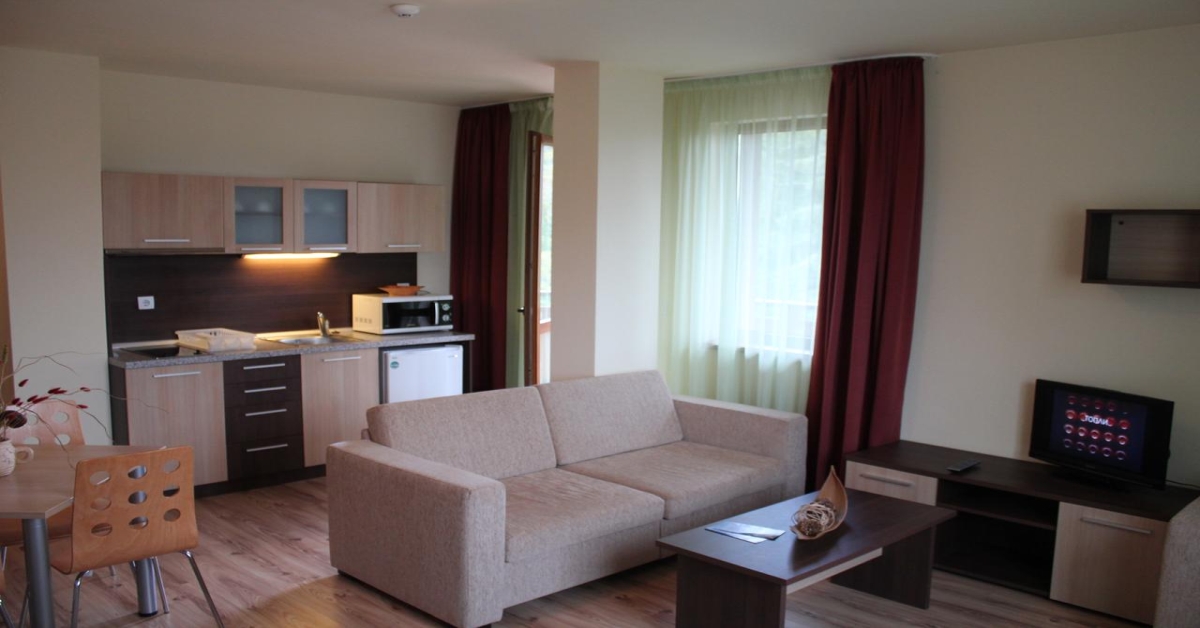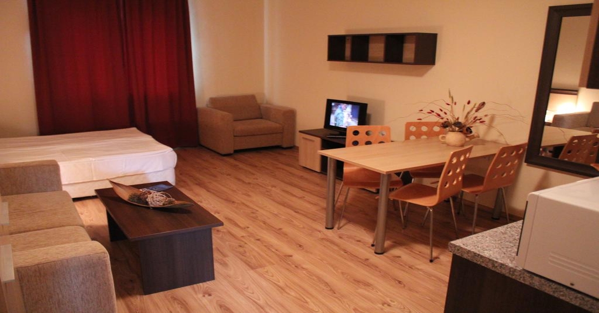 Апартамент - хол, спалня и санитарен възел. Холът е обзаведен с мека мебел, телевизор LCD и интернет. Спалните са оборудвани със спалня или индивидуални легла, гардероб, нощни шкафчета. Помещенията са оборудвани с хладилник, керамични котлони и микровълнова печка, но НЕ разполагат с посуда за готвене. Подходящи са за 4 човека, като двама се настаняват на разтегателен диван. Баните са обзаведени с душ кабина, санитарен възел, сешоар, бойлер.