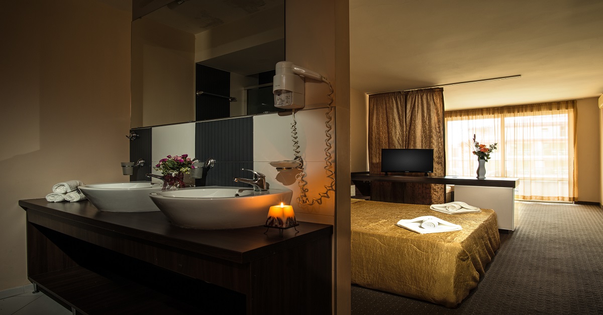 Студио 30 кв.м - спалня, тоалетка с голямо огледало, телефон, мини бар, мека разтегателна мебел с холна масичка, телевизор с кабелна телевизия, климатик, бани с душ кабина и сешоар.