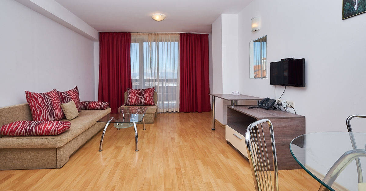 Стаи: Всички помещения са обзаведени с място за хранене и почивка, хладилник, телевизор, Wi-Fi, допълнителен разтегателен диван. В двуспалните апартаменти едната спалня и дневната са преходни, без междинна врата.