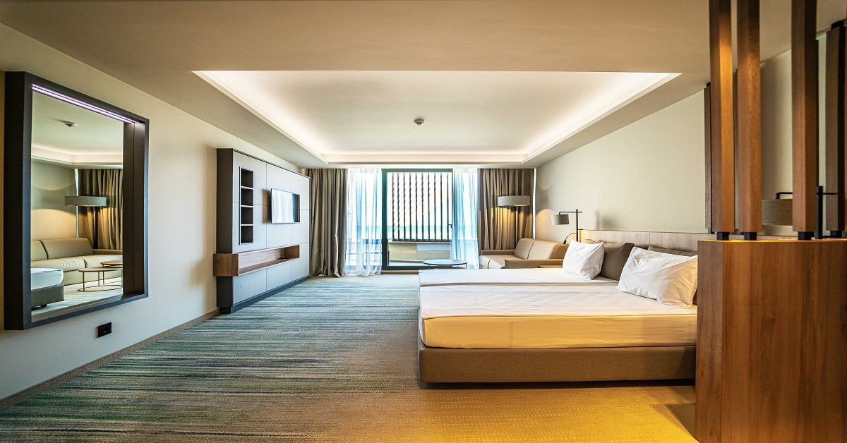 Стаи: Стандартна двойна стая - 40м2 - разполагат с 2 единични легла, двоен разтегателен диван, безплатен мини-бар, който се зарежда на ежедневна база с минерална вода, безалкохолни напитки и бира, персонален сейф (безплатно ползване), телефон, кафе машина, електрическа кана, сешоар, козметично огледало, луксозна козметика и принадлежности, детски комплект за баня, специално меню за избор на възглавници, меню за избор на аромат в стаята, халати и чехли, 43-инчов телевизор, кабелна телевизия, безплатен Wi-Fi, централизирана климатична система, баня с душ и двоен умивалник, балкон или тераса с маса и 2 стола.