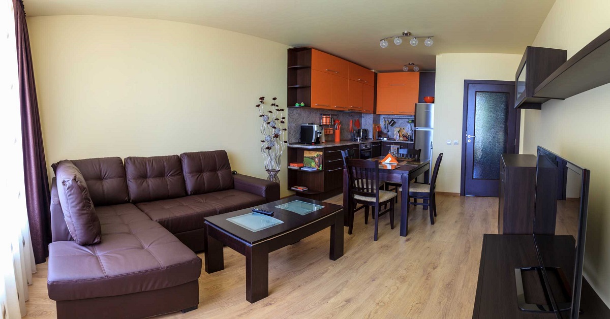Апартамент Класик 2+2 - отделна спалня, разтегателен диван, дневна с кухненски бокс и трапезария, баня с душ кабина, тераса с изглед басейн и градина.