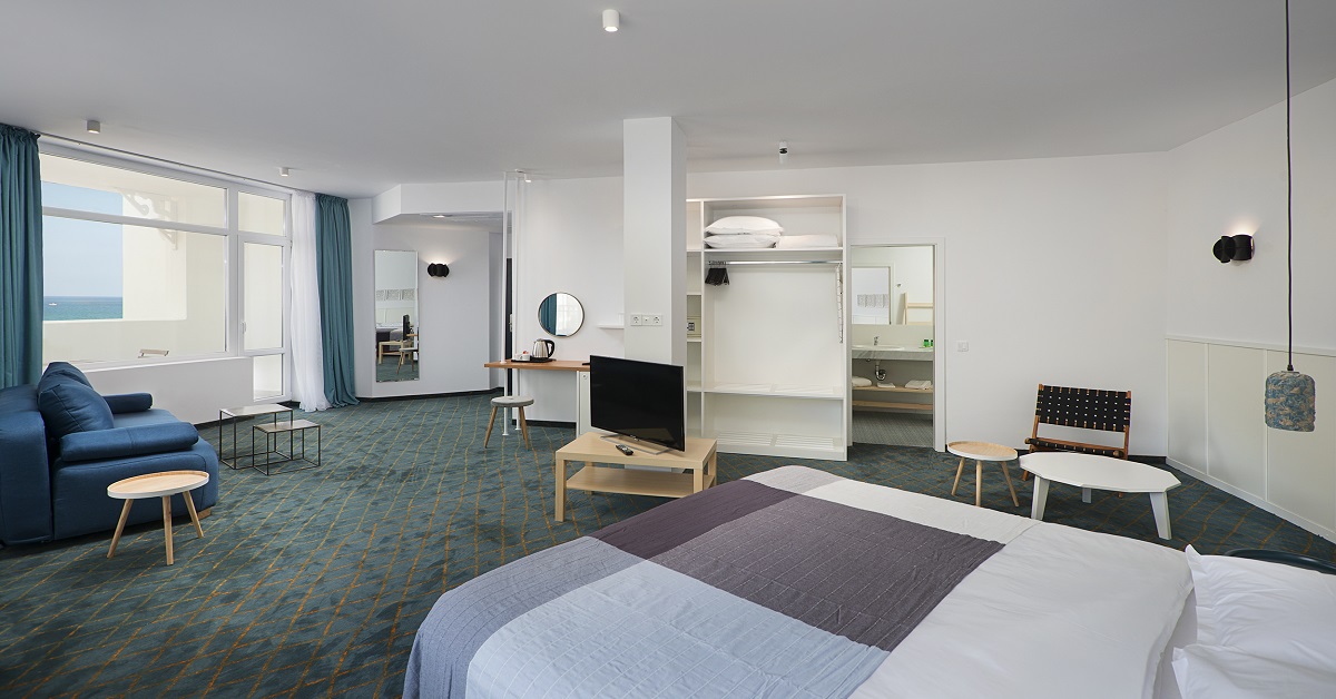 Джунър суит – спалня, разтегателен диван, баня с душ и тоалетна, сешоар, балкон, климатик, мини хладилник, телефон, сателитна телевизия, LED телевизор, сейф.