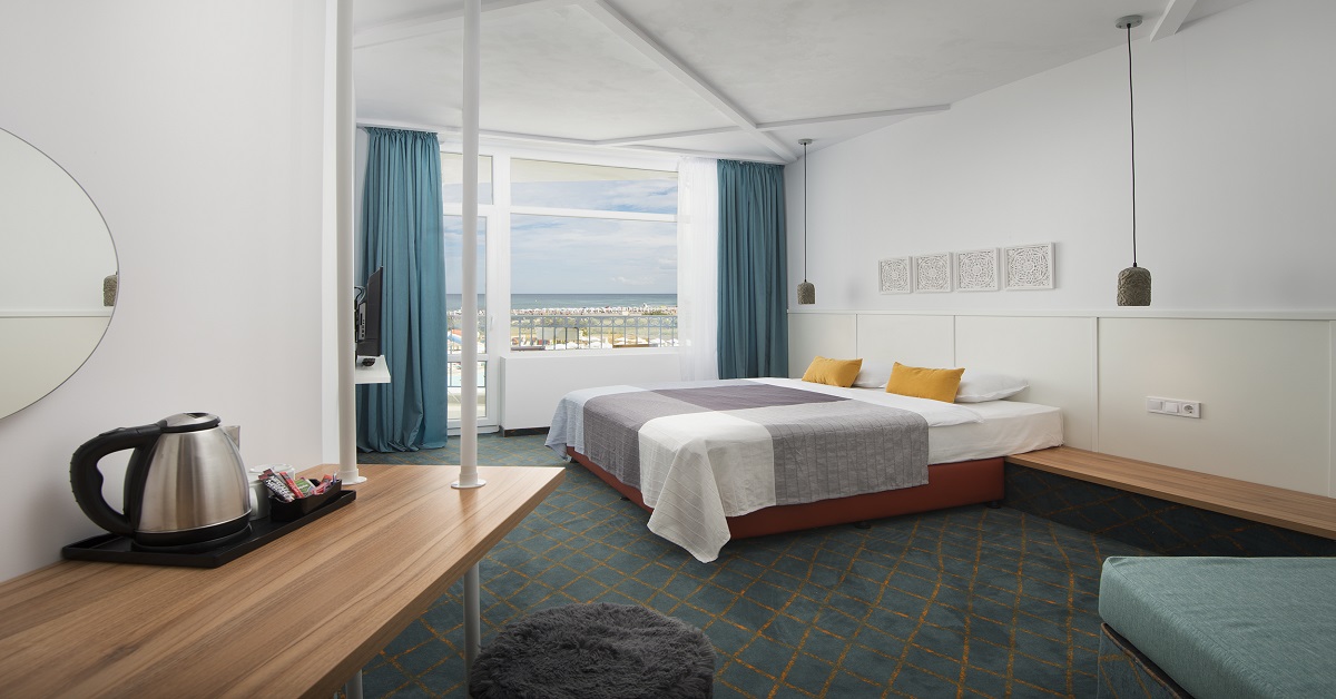 Стаи: Двойна стая с изглед парк/ море 28 кв.м. (без балкона) – спалня, допълнително легло, баня с душ и тоалетна, сешоар, балкон, климатик, мини хладилник, телефон, сателитна телевизия, LED телевизор, сейф.
