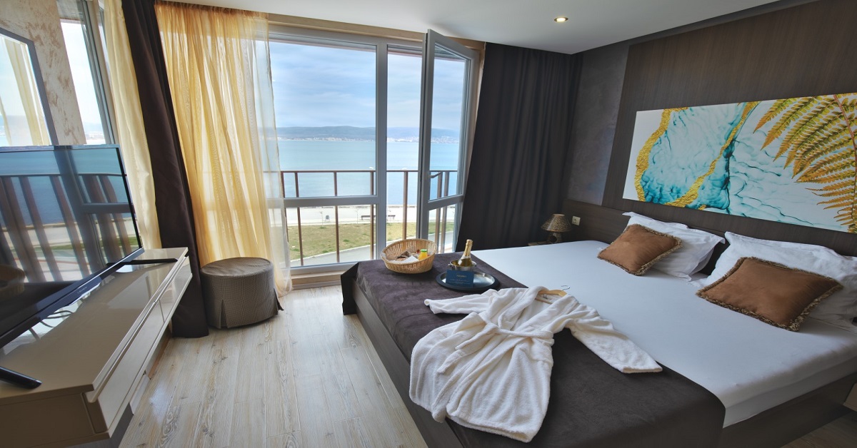 Стаи: Двойна стая с гледка море, 20 m² - спалня с удобно двойно легло, луксозна баня и тераса.