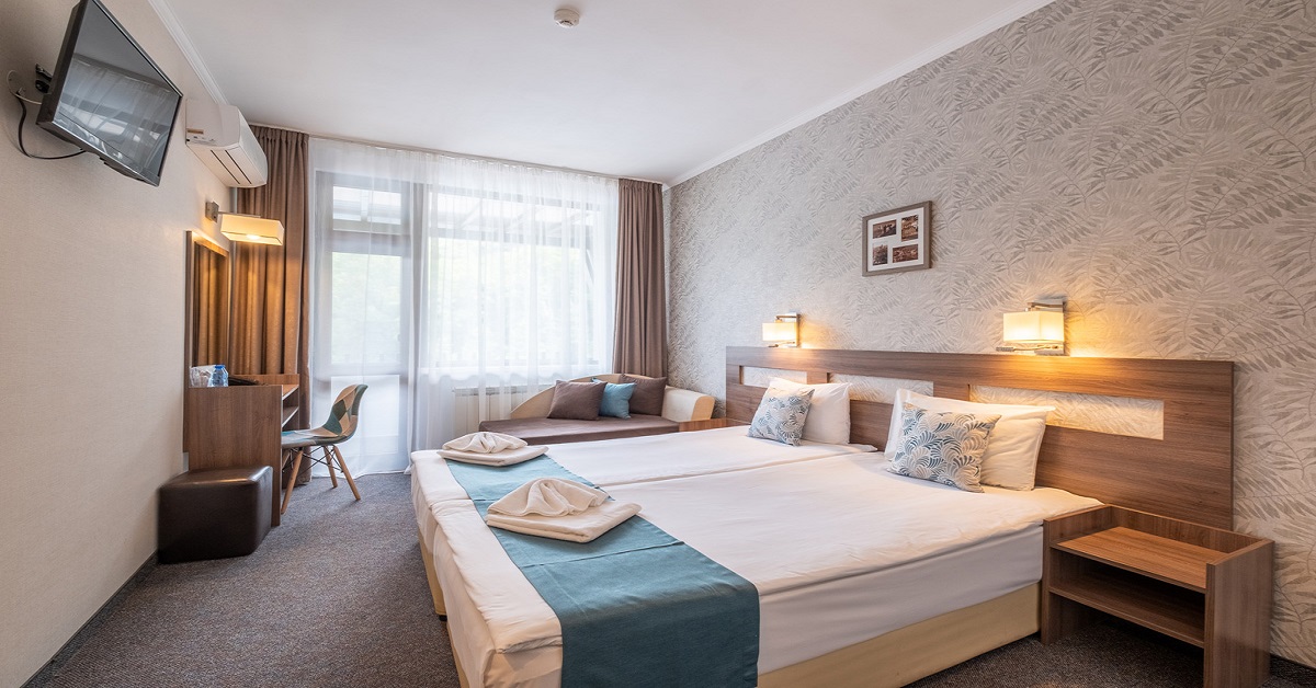 Стаи: Всички помещения са модерно обзаведени и оборудвани с индивидуален климатик, отоплителна инсталация, сейф, хладилник-минибар, LCD телевизор с IP телевизия, телефон, баня с душ-кабина и сешоар, тераса в част от стаите и апартаментите. Във всички помещения има безплатен високоскоростен безжичен интернет.