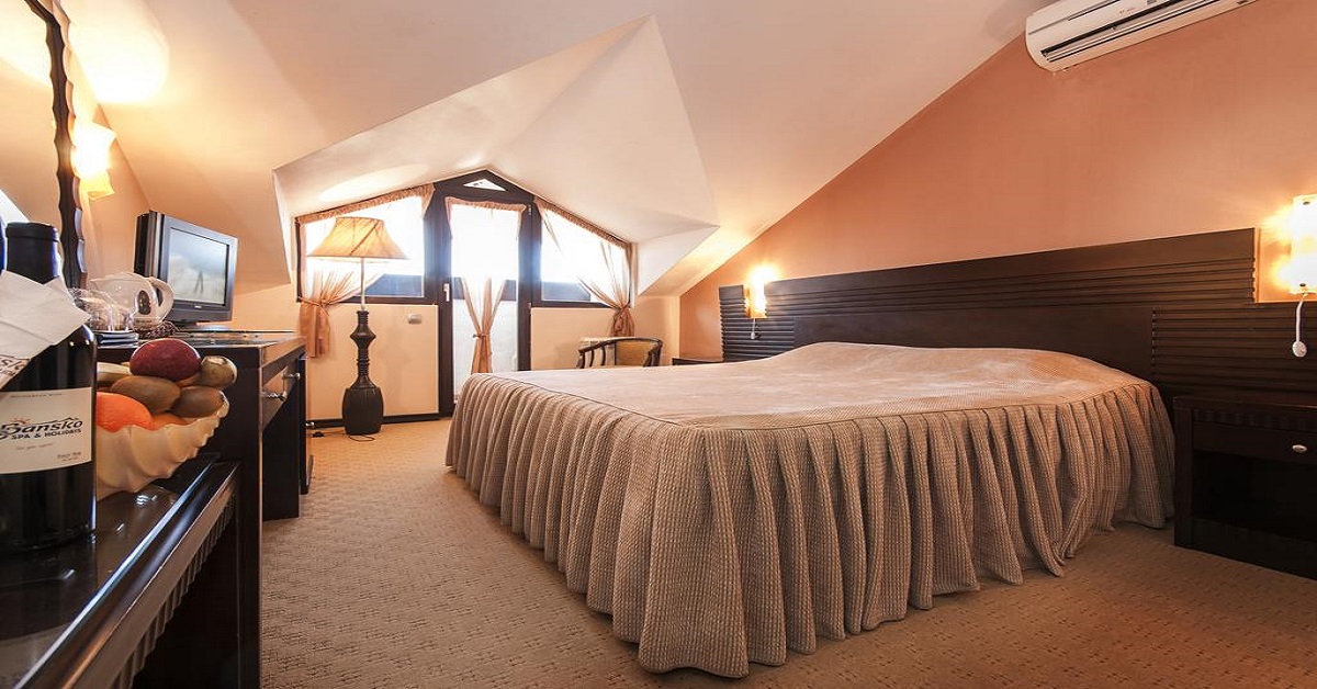 Мансардна стая - на последния етаж на хотела, с уникална гледка към високите върхове на Пирин. Стаята разполага с баня с вана, телевизор, бюро, мини хладилник, кана за топла вода, кафе, чай и вода комплимент от хотела.
