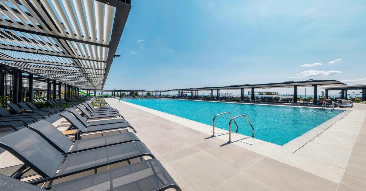 Басейни и Аквапарк: основен басейн за възрастни, 2 детски басейна с подгряване (28°С - 30°С), бебешки басейн с подгряване (28°С - 30°С), аквапарк с 5 пързалки, шезлонги около басейна.