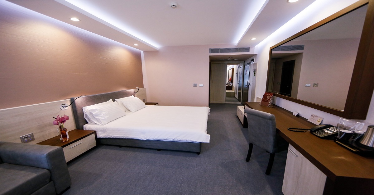 Стаи: Двойна стая делукс, 30 кв.м - спалня или две отделни легла с възможност за събиране, работно пространство, кът за отмора, 40” LED HD телевизор, сейф, електрическа кана и зареждане на чай и инстантно кафе, мини бар, баня с душ кабина, сешоар, телефон, увеличително огледало, паник бутон, първокачествена хотелска козметика Thierry Mugler, памучни халати, чехли, дъска за гладене и ютия.