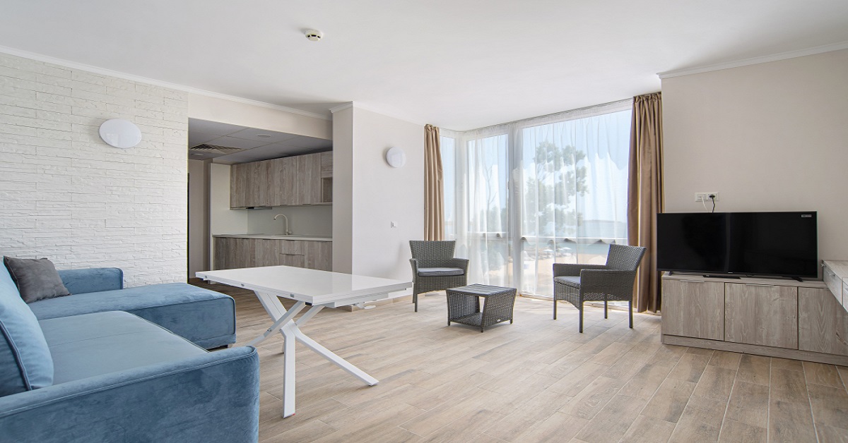 Стаи: Всички помещения разполагат с двойно легло или две единични легла, разтегателно кресло/ диван, индивидуален климатик, собствен санитарен възел, сешоар, тоалетни принадлежности, балкон с маса и столове, телевизор с плосък екран, кабелна телевизия, безжичен интернет.