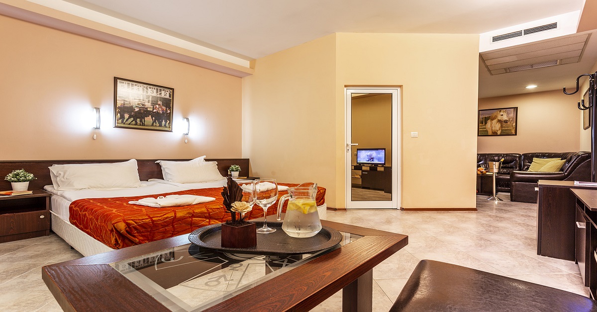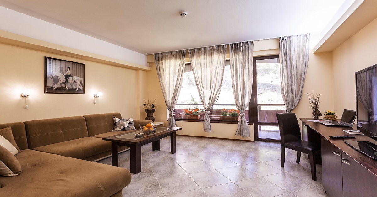 Едноспален апартамент, 70 кв.м. - състои се от две преходни помещения без врата между тях, едното от които е спалня с двойно легло, а другото - хол с разтегателен диван, кът за сядане, бюро, телевизор с кабелни канали, климатик, мини бар, безжичен интернет достъп и голяма тераса с изглед към боровата гора, баня с вана и душ кабина, сешоар, халати и козметика. Максимално настаняване на 2 възрастни с 2 деца или 3 възрастни с 1 дете.