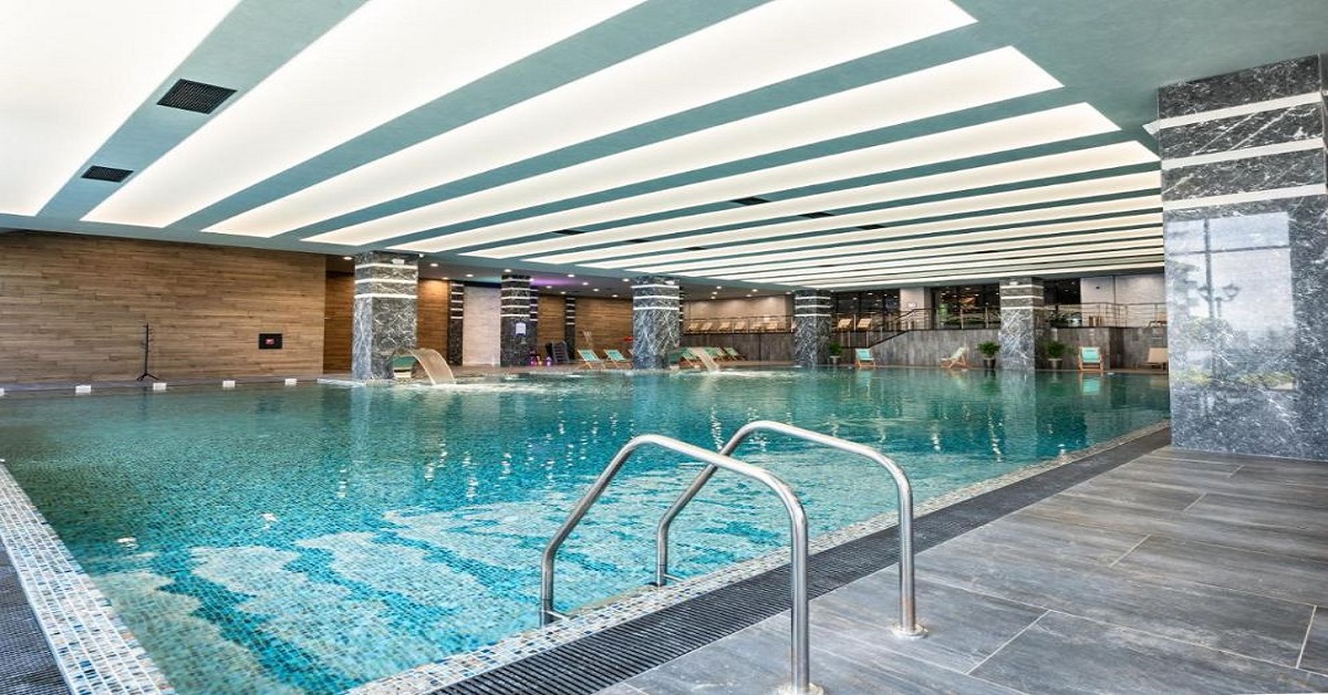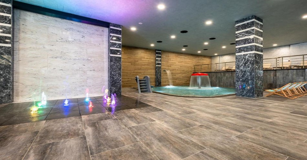 Във вътрешната част има джакузи, римски, турски, детски и голям плувен басейн.