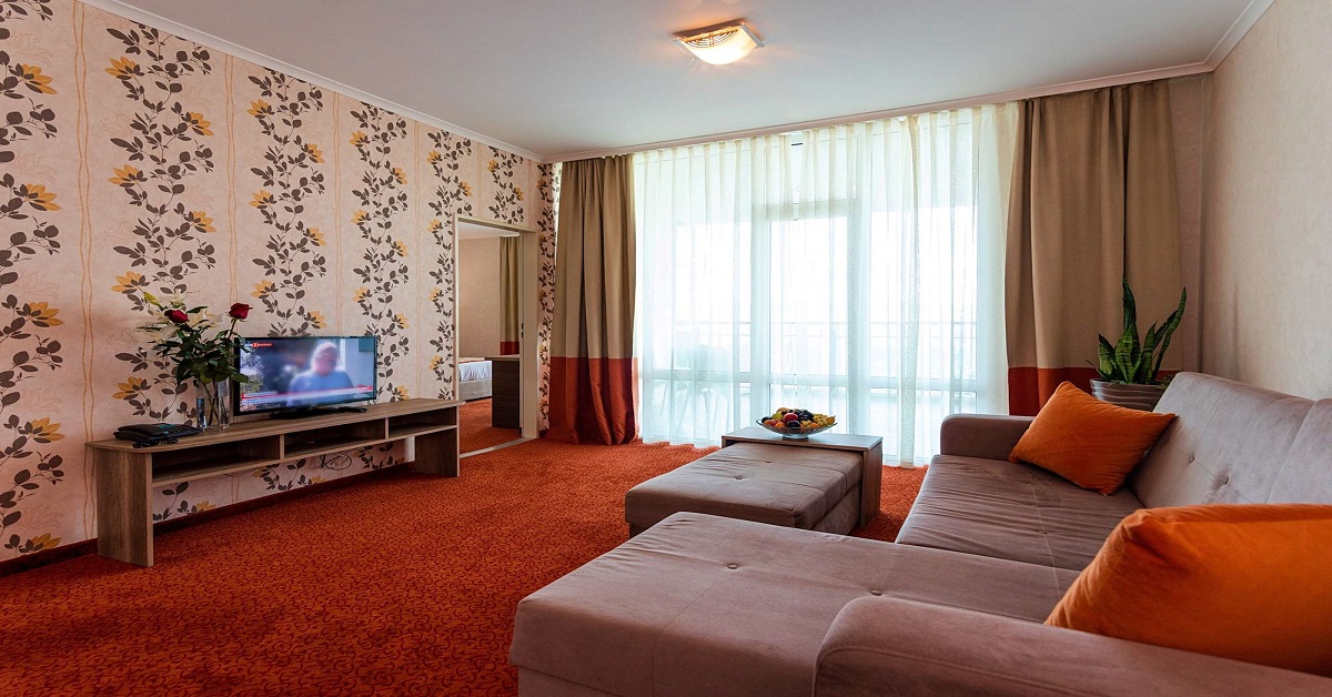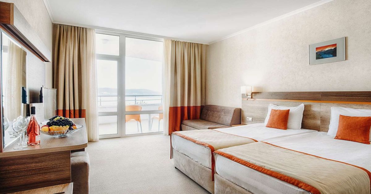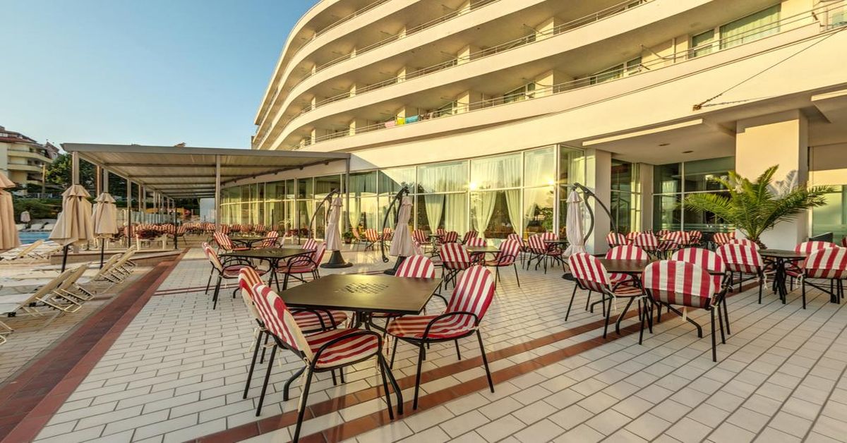 Хотел: Хотелът е реновиран изцяло 2024-2025 година! Разполага с 225 двойни стаи и 15 апартамента, по-голямата част от тях разкриват панорамен морски изглед към залива на Слънчев бряг.