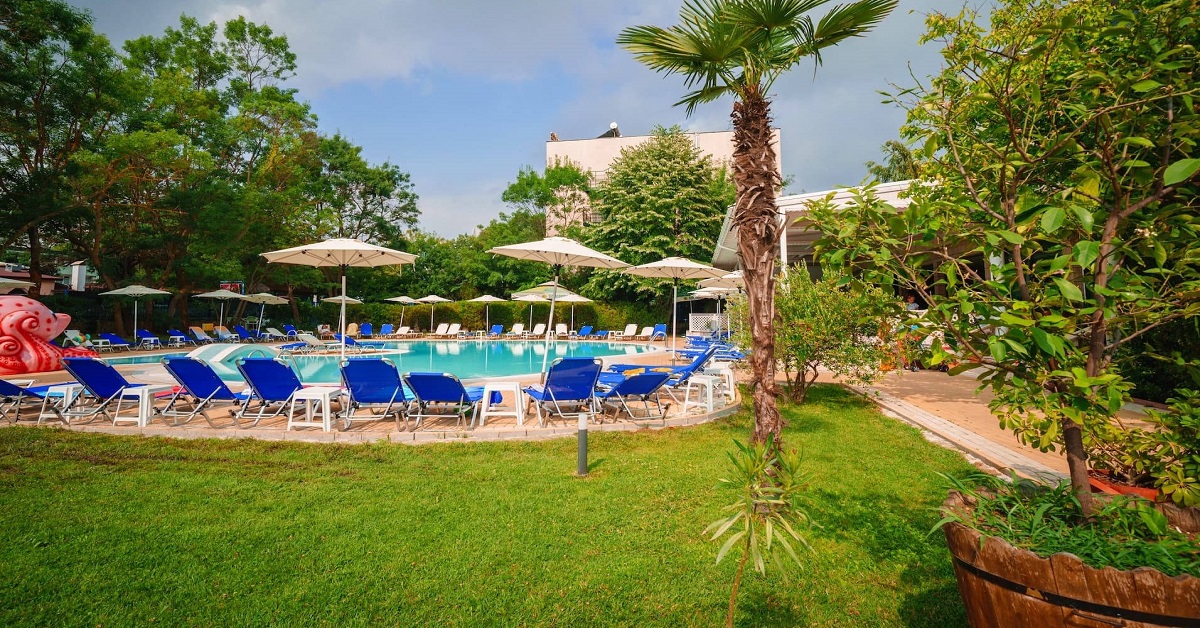 Чадъри, шезлонги на басейна на хотела.